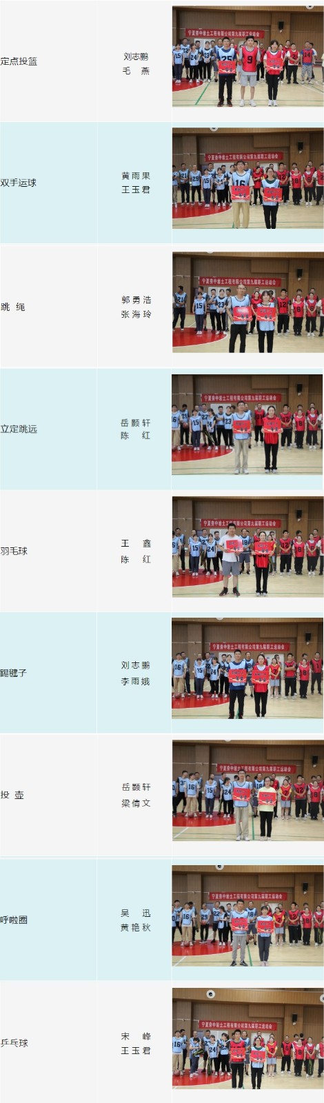 本屆職工運(yùn)動(dòng)會(huì)比賽項(xiàng)目設(shè)立了定點(diǎn)投籃、跳繩、立定跳遠(yuǎn)、踢毽子等9項(xiàng)個(gè)人項(xiàng)目,還有腰旗橄欖球、空中接力、拔河等5項(xiàng)團(tuán)體項(xiàng)目。